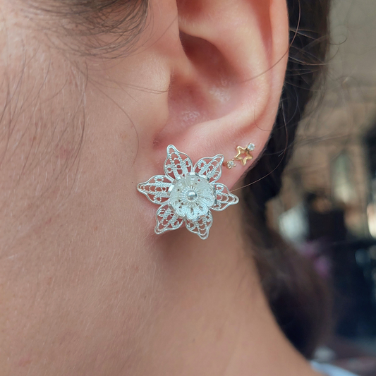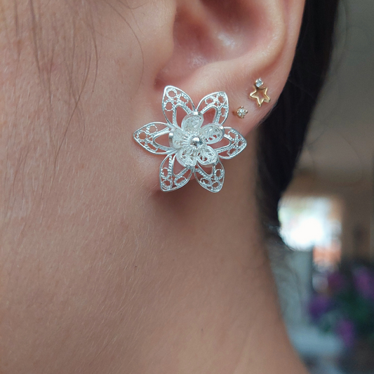 Aretes de Filigrana de Plata doble flor 5 Pétalos calados y escarcha