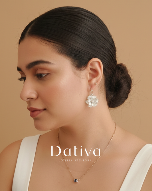 Arete Filigrana de plata doble flor puntas con flor de corazón central y escarcha
